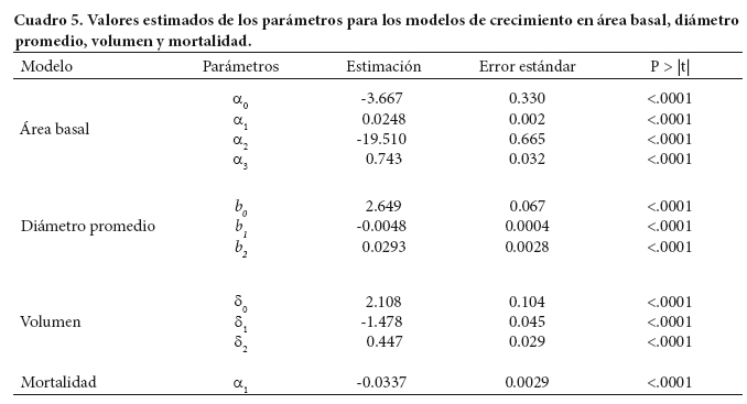 La obtención de las ecuaciones de HD e IS permitió continuar con el desarrollo del SCRM, ya que fueron de utilidad para explicar el crecimiento en DP, AB y V. El ajuste y los parámetros estimados para el resto de las ecuaciones que integran el SCRM muestran una precisión alta, que explica de 88.4 a 99.7 % la variación total observada en las variables de interés (Cuadro 4). La alta significancia de los parámetros (P < 0.0001) y sus pequeños errores estándar hacen robustos y confiables los modelos de crecimiento propuestos (Cuadro 5). De éstos, los modelos de proyección destacan por presentar SCE y CME más bajos, así como un R2 más alto que los modelos de predicción.