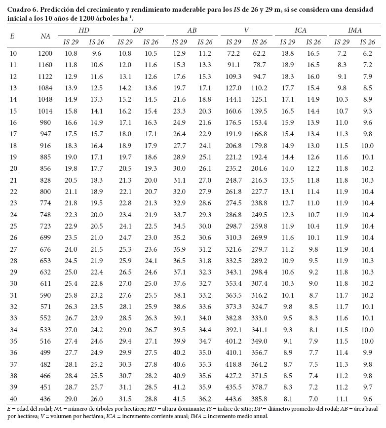 El uso de las ecuaciones del sistema permite representar, en términos numéricos, la vida de un rodal mediante una tabla de rendimiento, la cual muestra el cambio en la magnitud de cada una de las variables dasométricas de interés a medida que cambia su edad. Sin embargo, el SCRM propuesto representa múltiples tablas de rendimiento e innumerables combinaciones para el manejo de la densidad. El Cuadro 6 presenta una tabla de rendimiento de densidad variable, para los rodales de Pinus patula en los IS más comunes del estudio que están entre los 26 y 29 m de altura dominante (HD).