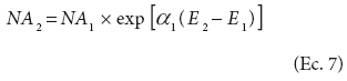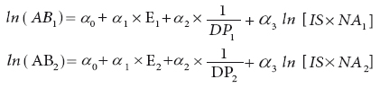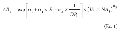 donde AB1 es el área basal (m2 ha-1) a la edad E1; DP1 es el diámetro promedio (cm) a la edad E1; NA1 es el número de árboles (ha-1) a la edad E1; a son los parámetros a estimar en el modelo.