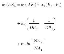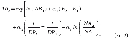 Esta última ecuación es la forma lineal del modelo de proyección para el logaritmo de AB. Si se aplica la función exponencial en ambos lados de la ecuación, se obtiene el modelo no lineal de proyección siguiente: