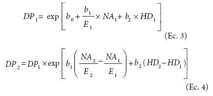 La presencia y combinación de variables de predicción como DPi y NAi en la Ec. 2, requiere de ecuaciones que las definan y sean parte del SCRM. Así, para el DPi se propone el siguiente par de ecuaciones compatibles de predicción y proyección: