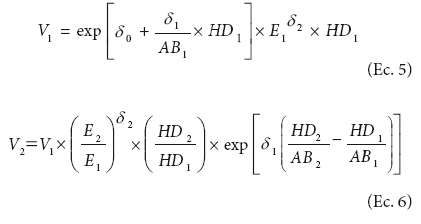 donde V1 es el volumen (m3 ha1) a la edad E1; V2 es el volumen (m3 ha-1) a la edad E2; di son los parámetros a estimar.