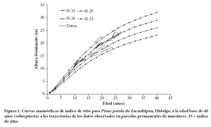 El análisis estadístico muestra que el modelo anamórfico de Hossfeld IV resultó superior, porque presentó coeficientes de determinación (R2) ligeramente más altos para las ecuaciones de predicción y proyección, y sobre todo porque tuvo los valores más pequeños en SCE y CME (Cuadro 2). Con base en estos criterios y en la evaluación gráfica de su comportamiento respecto a la trayectoria de los datos de campo, se eligió este modelo para la construcción de las curvas de crecimiento en altura dominante (Figura 1).