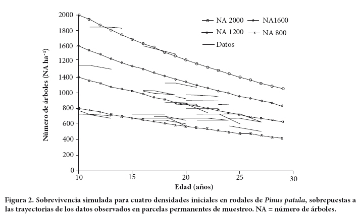 Como parte esencial de la estimación del crecimiento y rendimiento maderable, a nivel de unidad de superficie es necesario hacer pronósticos del número de árboles sobrevivientes en un tiempo determinado. Para tal propósito se ajustó la siguiente ecuación de proyección (Torres y Magaña, 2001):