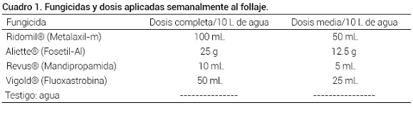 Bajo invernadero se sembró el cultivar de papa Ágata en bolsas de plástico, en un diseño experimental completamente al azar. El experimento constó de aplicaciones semanales al follaje de dosis completa o media de cuatro fungicidas (ocho tratamientos) más el testigo con aspersión de agua, para un total de nueve tratamientos (Cuadro 1). Se inició la aspersión foliar de los productos a los 30 d después de la emergencia y hasta cuando la planta estuvo en etapa de iniciación de tubérculos, cinco semanas después. Cada semana se tomaron muestras de follaje antes de la aspersión (30 g de hoja de la parte media de la planta) para el posterior análisis enzimático.