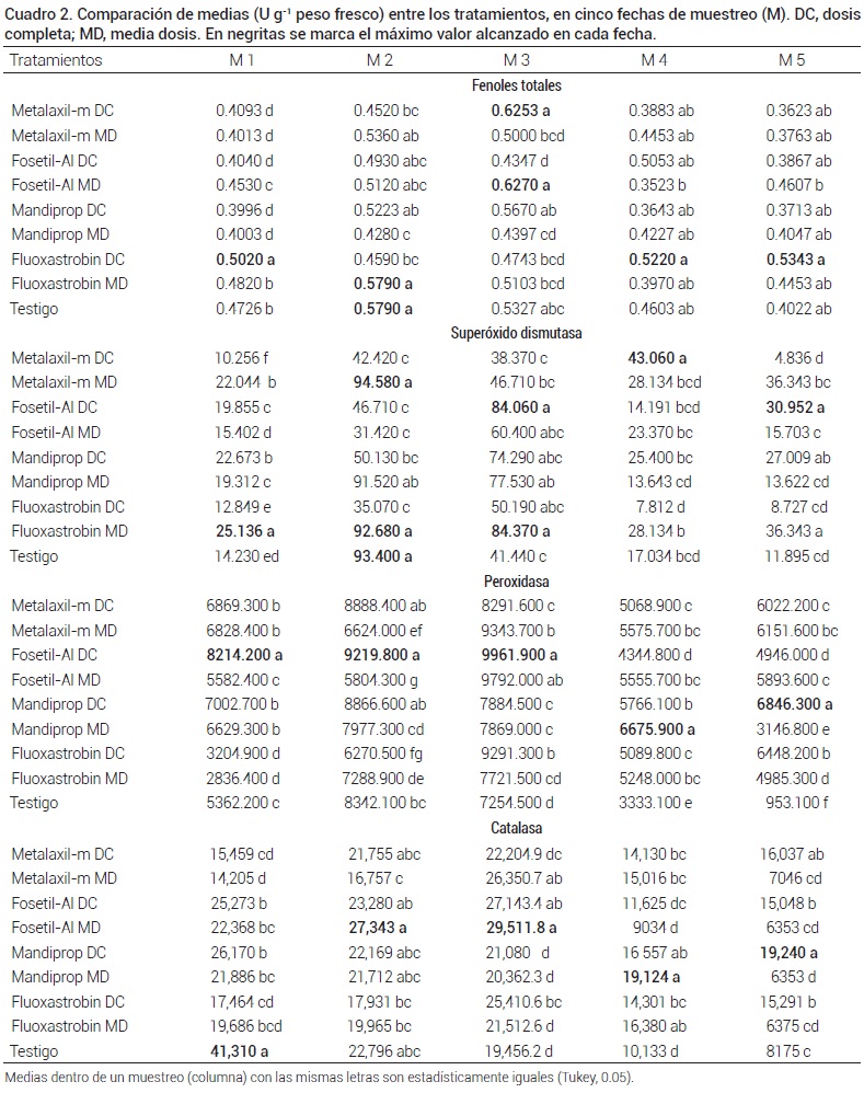 Los tratamientos, en las dos dosis, estimularon uniformemente la actividad de la peroxidasa (POX) por encima del testigo, al final del ciclo (Cuadro 2). No obstante, los valores más altos se obtuvieron en los primeros tres muestreos a dosis completa y en la tercera fecha para las dos dosis, particularmente con fosetil-Al. En esta fecha también sobresalió la fluoxastrobina en dosis completa y metalaxil en media dosis, con valores muy cercanos a los del fosetil-Al. En el último muestreo la acción de la POX continuó descendiendo a valores casi imperceptibles en el testigo sin productos, mientras que los fungicidas la aumentaron ligeramente con respecto a su muestreo previo.
