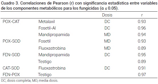 Las variables cuantificadas en el presente estudio corresponden a una ruta de metabolismo oxidativo, por lo que su respuesta podría estar, si no mutuamente dependiente, por lo menos relacionada. Cuando se aplicaron los productos en medias dosis, no se identificó correlación alguna con significancia estadística entre la presencia/actividad de las enzimas por efecto de metalaxil-m. No obstante, con estas mismas medias dosis se encontró coincidencia de comportamiento con significancia estadística entre las correlaciones POX/CAT por estimulación de mandipropamid, y de POX/SOD por fosetil-Al y fluoxastrobina (Cuadro 3).