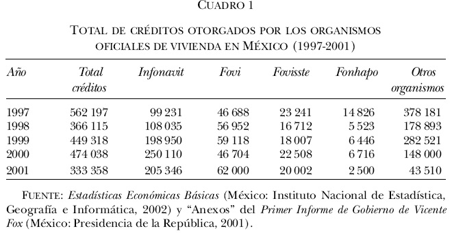 Con el arribo del nuevo gobierno federal en diciembre de 2000, esa presencia se ha vuelto incluso más directa, como se hizo notar en la reunión sobre vivienda realizada en junio de 2002 en Guadalajara, donde Alberto Gutiérrez (consultor del Banco Mundial) declaró estar impresionado por las metas que el gobierno federal se había propuesto en materia de vivienda. Asimismo, el funcionario sostuvo en su intervención que los lineamientos seguidos por el nuevo gobierno mexicano en su política habitacional, se inscribían plenamente dentro de las directrices planteadas por ese organismo. De manera más precisa, celebró que el Estado mexicano aplicara una política que permitiera "[. . .] obtener recursos de largo plazo, con mucho menor riesgo, para facilitar el financiamiento de vivienda desde el punto de vista del sector privado".8 En sentido similar se pronunció otro funcionario del Banco Mundial, el gerente del sector de Desarrollo Privado, Financiero y de infraestructura del organismo, durante la realización del XVI Encuentro Internacional de Vivienda, celebrado en Guadalajara, Jalisco, en la primavera de 2002.