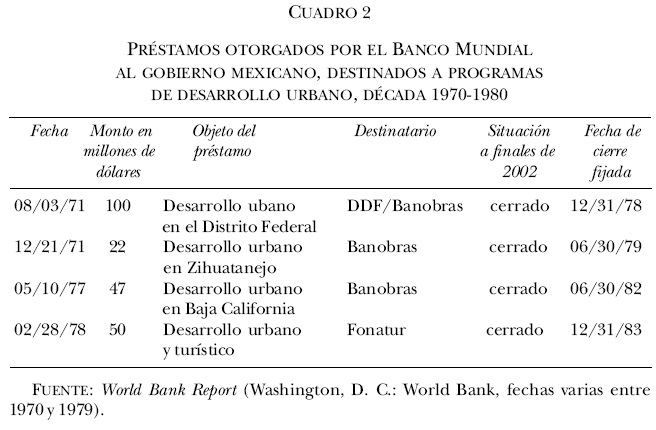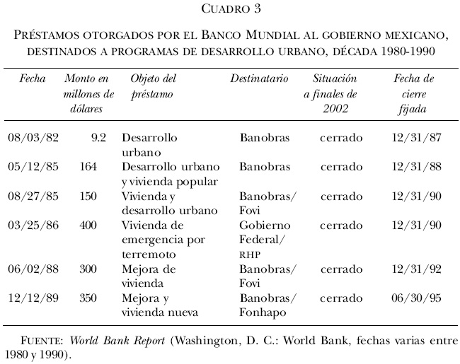 En la década iniciada en 1980, continuaron las empréstitos otorgados por el Banco Mundial para cubrir gastos correspondientes a desarrollo urbano. El primero de ellos se concretó el 3 de agosto de 1982 y se concedieron 9.2 millones de dólares al gobierno federal mexicano para realizar obras urbanas. El 12 de mayo de 1985 se otorgó el siguiente préstamo y fue concedido a Banobras, con un monto de 164 millones de dólares para los mismos fines que nos ocupan. Pocos meses después, el 27 de agosto del mismo año y con una cifra de 150 millones de dólares, se concedió mediante el propio Banobras un crédito destinado al financiamiento de vivienda y desarrollo urbano. A raíz del terremoto de septiembre de 1985, se aprobó (el 2 de marzo de 1986) un empréstito de emergencia por 400 millones de dólares, fundamentalmente dirigido a los programas habitacionales de reconstrucción en la Ciudad de México. Dos años más tarde, el 2 de julio de 1988, se concretó otro empréstito por 300 millones de dólares destinados a desarrollo de vivienda y otros equipamientos urbanos, otorgado al Fovi por medio de Banobras. El último financiamiento que el Banco Mundial proporcionó al gobierno mexicano para vivienda en esa década se contrató el 12 de diciembre de 1989 y ascendió a 350 millones de dólares, los cuales fueron destinados a programas de apoyo para mejoras y construcción de viviendas destinados a familias de bajos ingresos; fue concertado por Banobras y transferido al Fondo Nacional para las Habitaciones Populares.14 Los préstamos concedidos en esa década se ajustaron a los lineamientos señalados en la anterior, como puede apreciarse en el cuadro siguiente.