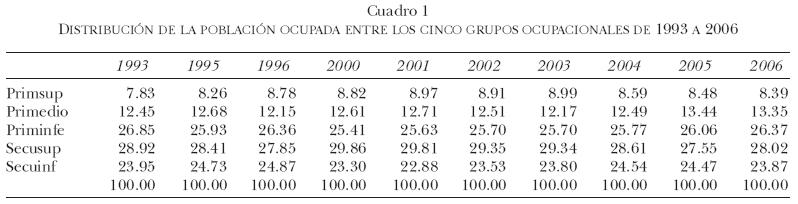 En términos de pura clasificación, la anterior segmentación es más amplia que la frecuentemente utilizada de trabajadores manuales y no manuales, ya que existe gran heterogeneidad dentro de las mismas. Sin embargo, es pertinente señalar que esta nueva agrupación con cinco categorías continúa siendo limitada, y es muy probable que dentro de las categorías de ocupación propuestas prevalezca aún una fuerte heterogeneidad asociada a las características de las empresas y a las habilidades de los individuos.7 A pesar de ello, consideramos que nuestra clasificación ofrece una estructura ocupacional más amplia que las tradicionales, sigue siendo sintética y, sobre todo, responde a un planteamiento teórico de segmentación laboral.