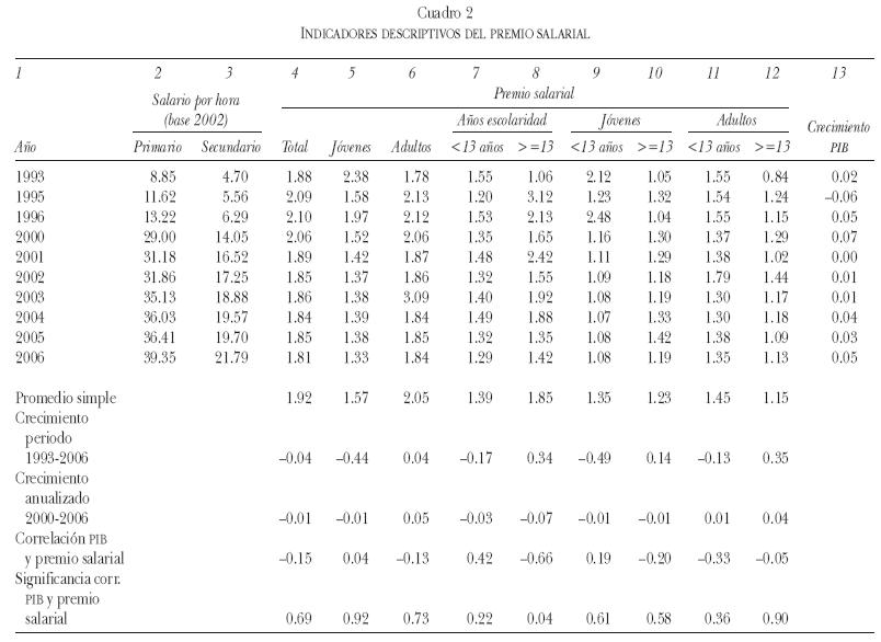 El cuadro 2 muestra, para diversos años del periodo 19932006, el premio salarial (wage premium)9 entre los segmentos del mercado primario y secundario. De igual manera, en el cuadro 2 se presenta también el premio salarial entre mercado primario y secundario entre la población joven (definida como menor a 30 años) y adulta (igual o mayor a 30 años), así como en la población con educación igual o mayor a 13 años de escolaridad (preparatoria completa o más) y menor a 13 años.10 Adicionalmente, el cuadro 2 presenta diversas estadísticas del premio salarial y la serie del crecimiento del PIB del país en términos reales.