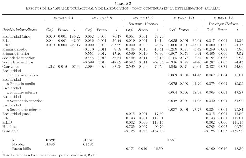 El ejercicio de regresión se realizó sólo para el año 2005 y abarca únicamente a los asalariados. El cuadro 3 presenta la estimación de varias especificaciones de la ecuación 2 por mínimos cuadrados ordinarios, y además se incluye la corrección de las estimaciones a partir del modelo de dos etapas de Heckman. En el modelo 3.A del cuadro 3 no involucramos el efecto de la segmentación laboral (es decir, se asume de inicio que Si = 0); en el modelo 3.B se involucran las categorías de segmentación pero no involucramos el término de interacción entre educación y segmento ocupacional
