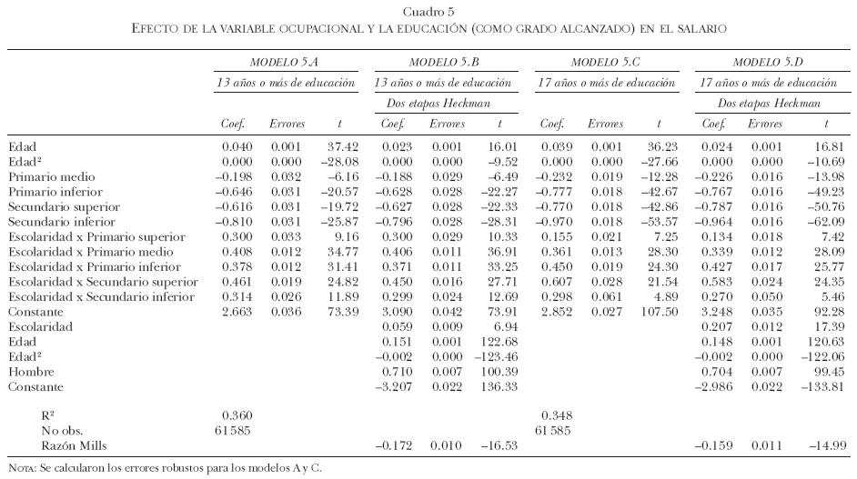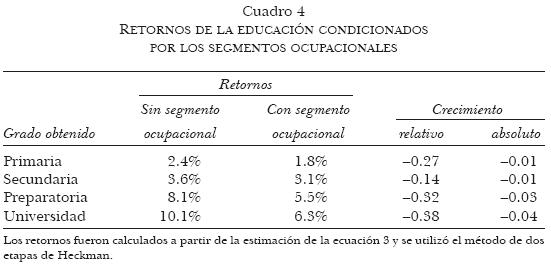 Como ya se señaló, los resultados pudieran estar condicionados al supuesto de que el efecto en los años de educación es acumulativo y que al considerar grados obtenidos podrían obtenerse hallazgos diferentes. Para analizar esta posibilidad, en el cuadro 4 presentamos las estimaciones de los retornos a la educación por "grado obtenido" a partir de la estimación de la ecuación 3 por el método de dos etapas de Heckman.