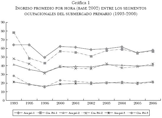 Por lo que respecta a las ocupaciones dentro del submercado primario (incluyendo trabajadores asalariados y por cuenta propia), se observa en la gráfica 1 que a partir del año 2000 hay una diferencia en el ingreso por hora promedio a precios constantes (base 2002) de alrededor de 20 pesos entre el grupo primario superior y el primario medio, y también entre el primario medio y el primario inferior (véase gráfica 1). En el grupo "primario superior" se observa además a partir de 1995 una ventaja de los asalariados respecto a los trabajadores por cuenta propia, pero dicha diferencia se reduce desde 2003, llegando a una diferencia mínima al final del periodo (situación que también se replica cuando se analiza el premio salarial; véase más adelante). Sin embargo, en los grupos primario medio e inferior no se observan desde 2000 diferencias importantes entre el ingreso por hora de los asalariados y los trabajadores por cuenta propia.