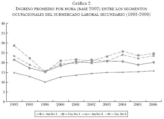 Las ocupaciones en el submercadosecundario (gráfica 2), aunque a niveles de ingreso más bajos, sí muestran diferencias importantes entre los trabajadores por cuenta propia y los asalariados. La ventaja la tienen los trabajadores por cuenta propia, y se amplía la brecha respecto a los asalariados a partir de 2003. En el secundario inferior siempre se observa ventaja para los trabajadores por cuenta propia, con tendencia a ampliarse la brecha en los últimos años. De cualquier manera, en ambos casos, su nivel de ingresos es más bajo que en otros segmentos; especialmente los asalariados muestran mayor precariedad en el submercado secundario.