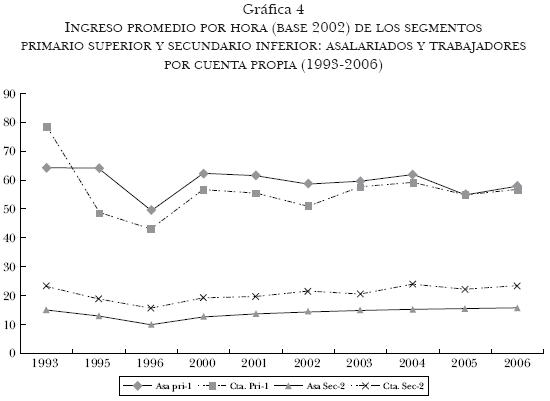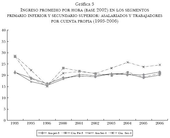 Al comparar a los asalariados y a los trabajadores por cuenta propia de los primarios de nivel inferior (administrativos y comerciantes) con los asalariados del secundario superior (gráfica 3), no se observan ingresos por hora sustancialmente diferentes. Pero a estos tres los supera el secundario superior en la categoría cuenta propia (gráfica 3).