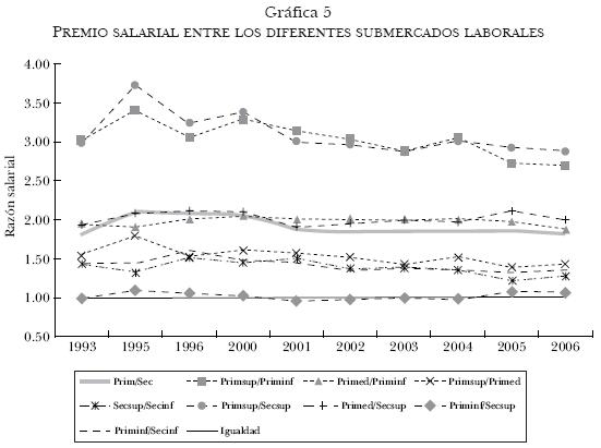 Para analizar las diferencias en el premio salarial al interior de los submercados y entre los submercados, en la gráfica 5 se presentan estas series añadiendo la serie del premio salarial entre el sector primario y el secundario (véase la línea más gruesa del gráfico).