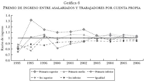 Hemos visto en las secciones anteriores que, en general, la desigualdad salarial promedio entre los trabajadores asalariados del sector primario y secundario ha disminuido durante los últimos años; asimismo, este comportamiento también parece registrarse entre varios de los diferentes grupos del mercado dual. Incluso, controlando por educación parece presentarse una situación de disminución salarial relativa entre los trabajadores más calificados. Pero por otra parte también hemos adelantado la idea de que, en general, la desigualdad salarial no puede ser explicada solamente por las dotaciones de "capital humano". En este sentido, en esta sección analizamos el premio de ingreso entre asalariados y trabajadores por cuenta propia (que no son empleadores) en cada uno de los segmentos del mercado dual.14 Emprendemos esta comparación no sólo por la importancia que en México tienen los trabajadores por cuenta propia (constituyen más de 17% de la población ocupada en las áreas más urbanizadas y en el total nacional superan el 26%), sino también porque al mostrar crecimiento tenemos que preguntarnos si los flujos entre categorías obedecen a mejores opciones de inserción laboral, vista a través del premio de ingreso. La gráfica 6 muestra el premio de ingreso entre estos dos grupos durante el periodo 19932005.