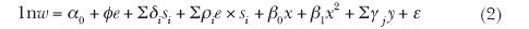 Donde φ es el coeficiente asociado a los años de escolaridad, δ es el coeficiente asociado a cada uno de los segmentos ocupacionales (s) i del mercado dual, s es una variable dicotómica indicando presencia o ausencia del individuo en el segmento ocupacional del mercado laboral segmentado i, ρ es el coeficiente asociado a la interacción entre los años de escolaridad (e) en el segmento ocupacional (s) i del mercado dual, Β son los coeficientes asociados a las variables de edad x y x2 que son utilizadas como proxies de experiencia, γ son los coeficientes asociados a otras variables de control j (por ejemplo, sexo, sindicato), y ε es un término de error aleatorio con media cero.