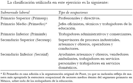 La ocupación principal es una de las características que se captan de la población ocupada. Se refiere a lo que el trabajador realiza específicamente en su actividad laboral; es decir, da cuenta del oficio, las tareas o la profesión que efectivamente desempeña. Por lo tanto, es la mejor manera de acercarse a su calificación o atributos individuales como trabajador. No importa en qué sector de actividad se ubique ni con qué categoría. En este sentido, hemos agrupado las ocupaciones en cinco grandes categorías6 con la finalidad de construir un submercado primario y otro secundario para el caso mexicano y con ello evaluar si una hipótesis de dualidad contribuye al análisis del comportamiento de la desigualdad salarial durante los años recientes. Para construir la segmentación hemos considerado los lineamientos de estratificación de Piore (1973), que hacen uso explícito de los grupos ocupacionales para segmentar el mercado laboral; hemos realizado también algunas adecuaciones de esta segmentación para el caso mexicano, que consisten básicamente en añadir un tercer grupo ocupacional al submercado primario (véase cuadro).