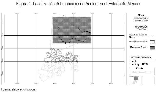 El municipio de Aculco pertenece al distrito VIII de Jilotepec. Se localiza en el noroeste del Estado de México entre las coordenadas 20° 16' 20'' de latitud norte y 99° 59' 10'' de longitud oeste (figura 1). La delimitación geográfica corresponde a los límites con los municipios del Estado de México y del estado de Querétaro (Nolasco, 1999).