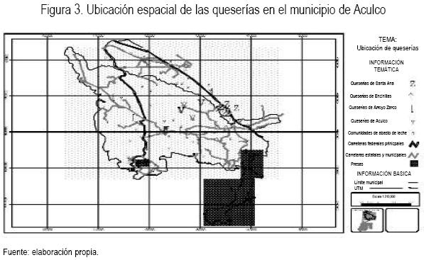 Dada la ausencia de datos del número y ubicación de las queserías en la zona de estudio, como primer paso se estimó la población de agroindustrias. Se consultó al delegado de cada comunidad del municipio para obtener un número aproximado de empresas, así como el nombre de los productores. Posteriormente se visitó a los propietarios y cada quesería fue geo referenciada con un Sistema de Posicionamiento Global (GPS). Se obtuvo una base de datos que se introdujo en un Sistema de Información Geográfica (SIG) y se ubicó cada empresa espacialmente.