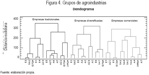El análisis de cluster expresó una representación gráfica por grupo de empresas en un plano cartesiano y consideró el número de variables por quesería con el mismo peso específico. El resultado fue la formación de grupos con características similares, homogéneos al interior y heterogéneos con otros grupos. La medida de similitud para la agrupación fue la distancia euclidiana (HAIR et al., 1998).