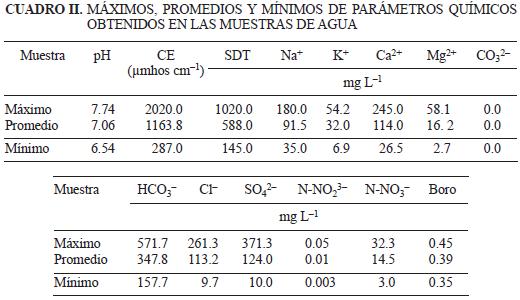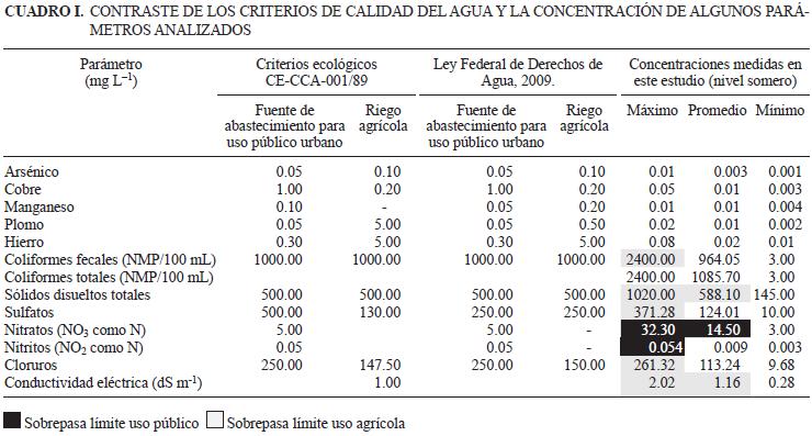 Para analizar la información obtenida de los estudios fisicoquímicos así como de algunos los metales más importantes en el agua, se compararon los resultados con diversos criterios de calidad del agua para consumo público urbano (sólo por estar contenidos en la misma normativa) y para uso agrícola según los criterios ecológicos (CNA 2009). Se comparó el contenido máximo, mínimo y promedio de todos los parámetros (Cuadro I) y se determinaron los valores de aquellos pozos que excedían los límites permisibles. También se clasificó el agua con criterios de riego agrícola de acuerdo con la clasificación de Richards (1982) (Cuadro II).