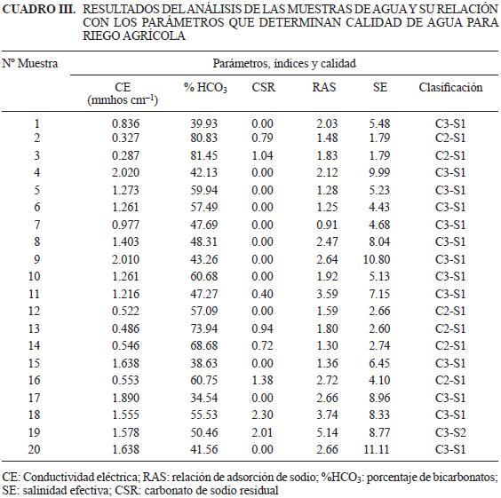 Con los parámetros obtenidos en los análisis de aniones y cationes, pH, CE y boro, se clasificó el agua de riego para uso agrícola según sus características químicas. La máxima, media y mínimo se presentan en la cuadro II. Dos de los parámetros más importantes para determinar la cantidad del agua para riego agrícola son los de CE y el Índice de la Relación de Adsorción de Sodio (RAS), con los que se establece una clasificación del agua para riego según las normas del Personal del Laboratorio de Salinidad de los Estados Unidos (Richards 1982). De acuerdo con lo anterior se obtuvieron los índices más comunes y su clasificación para su uso agrícola (Cuadro III).Con base en los resultados anteriores, se consideran en su mayoría aguas altamente salinas y bajas en sodio, lo que restringirían su uso para la agricultura, aunque se pueden usar en cultivos tolerantes a la salinidad y con buenas condiciones de drenaje, también pueden ser usadas con sistemas de riego que permitan mantener continuamente un bulbo de humedad en el sistema de raíces. Es decir, su uso estaría condicionado al manejo del cultivo y con utilización de cultivos tolerantes o medianamente tolerantes a las sales. Sin embargo, Ayers y Westcot (1985), señalan en contraposición, que para los mismos niveles encontrados en este estudio, sólo existe un grado de restricción moderado para su uso en cultivos agrícolas. En general, en este trabajo no se encontraron restricciones por niveles de boro, cloruros ni sodio.