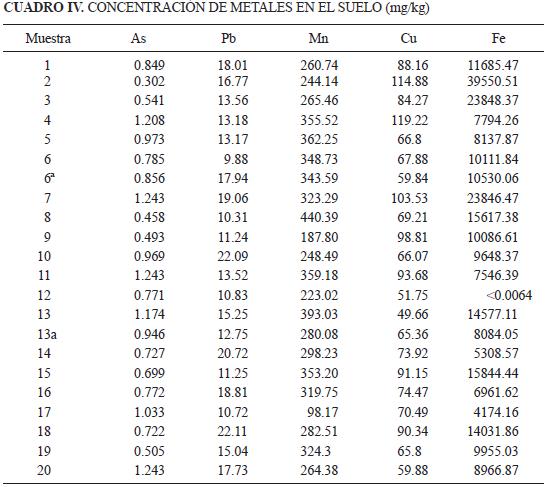 Las muestras de suelo fueron pulverizadas y se tomaron de 0.1 a 0.5 g para la determinación de elementos totales (Pb, Mn, Cu, Fe y As). Las muestras se colocaron en recipientes de teflón de 150 mL previamente lavados con HNO3 al 10 % por 24 y enjuagados con agua desionizada. En el procedimiento de digestión se lleva a cabo a reflujo. Se utilizó una placa de calentamiento con control de temperatura. Se corrió un blanco de método además de una muestra de estándar certificado MESS2 (NRCC, Nacional Research Council of Canadá) únicamente como muestra de referencia. Para la parte comestible de los cultivos se usó el método de digestión ácida a temperatura ambiente, que incluye un sistema cerrado indicado para metales que se volatilizan a las temperaturas de ebullición de soluciones ácidas. El cultivo seco fue digerido en recipientes de teflón de 150 mL previamente lavados con ácido (HNO3 al 10 % por 24 hr) y enjuagados con agua desionizada. El peso total (0.05 g) del cultivo liofilizado se colocó en los recipientes se añadió 100 uL de HNO3 concentrado por cada 2 mg de muestra. Los recipientes se cerraron con su tapa correspondiente y se dejaron en reposo al abrigo de la luz y del polvo, durante cinco días a temperatura ambiente. Se adicionaron 40 uL de peróxido de H2O2 30 % por cada 2 mg de muestra para optimizar la oxidación de la materia orgánica y se continúo con la digestión un día más en las mismas condiciones, hasta que se observó un aspecto traslúcido de la solución. El volumen de las muestras se ajustó con agua desionizada para obtener una concentración final de HNO3 grado ambiental (Anachemia) al 10 % v/v. Las muestras se digirieron por triplicado y se corrió un blanco de método. La cuantificación de As, Cu, Pb, Mn y Fe en las muestras de agua, suelo y cultivo, fue determinada por espectrofotometría de absorción atómica, con horno de grafito (AAHG; Perkin Elmer, Modelo 3110 y Varian, Modelo Spectra 220Z con horno GTA 110Z); se utilizaron lámparas de cátodo hueco multielemento y por flama (AAF; VARIAN Spectr AA 220 FS).