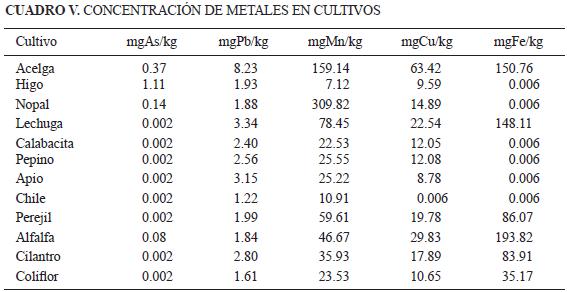 Por otra parte, los metales pesados, están presentes naturalmente en los suelos, pero en los últimos años actividades industriales y residuos de todo tipo han contribuido a una acumulación de estos elementos en este medio (Giuffré 2005). Con base en la NOM147SEMARNAT/SSA12004, que establece criterios para determinar las concentraciones de remediación de suelos contaminados por arsénico, bario, berilio, cadmio, cromo hexavalente, mercurio, níquel, plata, plomo, selenio, talio y vanadio, no se encontraron en el presente estudio concentraciones que excedieran la NOM de 22 mg kg1 para el caso del As ni la de 400 mg kg1 para el caso del Pb. Las concentraciones de los metales detectadas en suelos de los sitios que se muestrearon se presentan en el cuadro IV. De acuerdo con estos datos, se puede observar que para el caso del As, Pb y Cu, los valores encontrados se encuentran dentro de rangos máximos aceptables y no se consideran fitotóxicos con base en Pais y Jones (1997) y KabataPendias (1993), quienes señalan que las concentraciones máximas aceptables en el suelo oscilan para el As entre 15 y 50 mg kg1, Pb entre 50 y 100 y para el Cu entre 50 y 100. Para el Mn, un elemento esencial para las plantas, se encuentra en el suelo en diversos niveles que van de 20 hasta 3000 mg kg1 y con un promedio de 600 mg kg1. Su disponibilidad variará según la forma en la que esté químicamente presente lo que afectará su disposición y absorción por las plantas. También el pH afectará su disponibilidad, cuanto mayor sea éste menos disponible se encuentra. Por último, el Fe, que representa el cuarto elemento más abundante en la corteza terrestre, se puede encontrar como reserva total desde 0.7 %, en promedio de 4 a 7 % (70 000 mg kg1) o incluso mucho más en función del origen del suelo, lo que significa que todas las muestras analizadas en el presente estudio se encuentran dentro de este rango. Finalmente, la concentración de algunos metales también analizados en agua y suelo, muestran que la absorción de los mismos por los cultivos puede ser muy variable en función de la especie. Cada cultivo tiene requerimientos específicos de cada elemento y la forma en la que se traslocan los elementos y son utilizados para sus funciones metabólicas también son distintos. En el cuadro V, se presenta la concentración encontrada de As, Pb, Mn, Cu y Fe en cada uno de los cultivos y puede ser contrastada con valores generales proporcionados por Jones (1998), quien señala que para elAs un nivel de suficiente a tóxico será entre 1 y 1.7 mg kg1. En el presente estudio no se encontraron niveles que excedan este valor; para el Pb los niveles son de 5 a 10 mg kg1, de igual forma no se exceden dichos límites; en el caso del Mn los niveles son de 20 a 300 mg kg1; para el Cu los niveles son de 5 a 30 mg kg1, en este caso sólo la acelga presenta un exceso de Cu, sin embargo está considerada como tolerante a este elemento; finalmente el rango normal generalizado para el Fe es de 100 a 500 mg kg1 lo que permite señalar que todos los niveles encontrados son normales para estos cultivos. Se advierte que las concentraciones varían de acuerdo a la especie, calidad de agua y condiciones del suelo, y que las plantas son receptoras pasivas de oligoelementos absorbidos por las raíces (Jones 1998), pero que para este estudio no representan un riesgo.