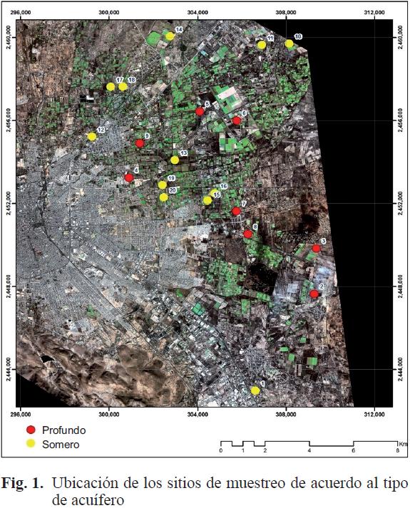 Derivado de un censo previo de 346 pozos, en el que se detectaron 120 pozos para uso agrícola, se realizó un muestreo aleatorio simplificado en el que se seleccionaron 20 puntos de muestreo de pozos profundos y someros (Fig. 1). Se utilizaron los siguientes criterios: 1) facilidad para el acceso dada la restricción para obtener información de los usuarios, 2) bombeo para extracción del agua y, 3) que el agua extraída se usara para el riego de cultivos.