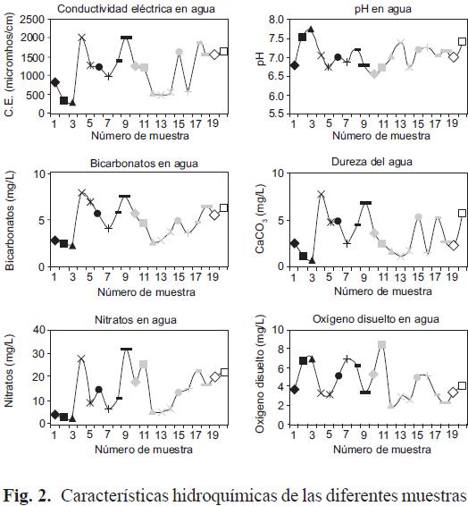 En general se encontró que existen algunos pozos en los cuales las concentraciones máximas sobrepasan los límites permisibles de algunos parámetros para consumo humano (Cuadro II), sin embargo, siguen operando para fines agrícolas con el riesgo de salud inminente, principalmente el relacionado con los coliformes totales. Por otra parte, en lo que se refiere a la CE que representa la salinidad del agua, más del 60 % de las muestras superan los 1000 umhos cm1, es decir más de un 1 dS m1 y con un pH cercano a la neutralidad. En relación con la dureza y los contenidos de Ca y Mg (grados hidrotimétricos franceses), al estar relacionados entre sí, se observa que casi un 70% de las muestras son clasificadas como aguas duras al exceder de 180 mg L1 de CaCO3. Con respecto a los nitratos, prácticamente un 75 % de las muestras superan el límite establecido para uso urbano, sin embargo, para uso agrícola no tiene restricción. En el caso del oxígeno disuelto, este no influye en aspectos agrícolas. En general, se puede inferir que los datos no pueden ser correlacionados entre cada uno de los parámetros, dado que pertenecen a distintas zonas y con distintas influencias en sus aportes hídricos. Incluso, aún cuando las muestras fueran separadas de acuerdo a su procedencia de acuíferos, sus características químicas son también diferentes (Fig. 2).