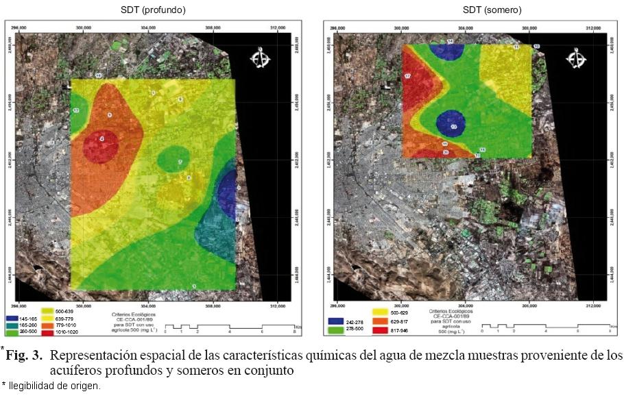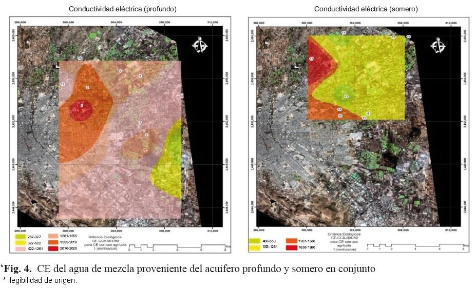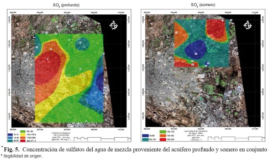 Así mismo, se puede observar mediante un mapa de ubicación espacial (Fig. 3),que para el caso de los SDT, existen zonas de mayor concentración en ambos acuíferos en los que se excede el límite para el uso de riego agrícola. Respecto al valor de la CE, los resultados igualmente no pueden ser correlacionados entre sí, sus características químicas proceden también de diferentes aportaciones (Fig. 4).Sin embargo, se puede observar que existen en ambos acuíferos, límites que restringen el uso de riego agrícola. Así mismo, la alta concentración de SDT puede ser explicada por la alta concentración de aniones y cationes expresada en términos de CE. Respecto al contenido de sulfatos, sus características químicas proceden también de diferentes fuentes y aportaciones (Fig. 5).Se puede observar que existen zonas de mayor concentración en ambos acuíferos en los que se excede el límite para el uso de riego agrícola. En el caso de los coliformes fecales y totales, las muestras que excedieron los parámetros fueron obtenidas de pozos con agua proveniente del acuífero somero, lo que fue corroborado en campo. En este caso, el 60 % de dichas muestras presentan problemas de coliformes y en todas ellas se excede el límite (ausencia o no detectables) propuesto por la NOM127SSA1994, lo que representa un problema potencial de salud.