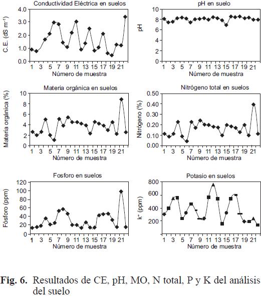 Con respecto a los suelos, estos se analizaron de acuerdo a su uso agrícola, se obtuvieron parámetros de propiedades físicas y químicas, que determinan el grado de fertilidad (Fig. 6).También se analizaron algunos elementos traza que desde el punto de riesgo ambiental pueden ser perjudiciales para los cultivos y para consumo animal, dado que dichos suelos han sido regados con aguas de muy baja calidad provenientes del acuífero somero cuyo origen en algunos casos son aguas provenientes de descargas industriales. De acuerdo al pH, se observó que el 95 % de los suelos tienen un nivel tendiente a la alcalinidad mayor de 8.0. No está claro el origen de la misma, dado que el pH del agua oscila entre 6.57.5, por lo que más bien puede estar referido a la composición mineral primaria del suelo. La importancia de este valor radica en que por encima del pH 7, la mayoría de los macro y micronutrientes es menor, lo que representaría una disminución en el rendimiento de los cultivos. Respecto a la conductividad eléctrica, se muestra que los suelos son no salinos, aún cuando en el agua de riego fue encontrado un alto contenido de sales. Esto puede deberse a que los suelos son en su mayoría migajón arenosos con un buen drenaje interno. La concentración de sales en los suelos analizados no representa un riesgo para que los cultivos se vean limitados por exceso de sales. De acuerdo con la materia orgánica analizada, el 95 % de los suelos están dentro del rango normal de materia orgánica (MO). Como se sabe la MO contribuye a que se presenten condiciones favorables de humificación en los suelos y que mejore la condición del medio de crecimiento de los cultivos. A partir de estos datos se estimó el N total, aunque este dato no es útil para diagnosticar la disponibilidad de este nutrimento en el suelo, representa un índice estimable y comparable. En general, el N favorecerá el desarrollo del cultivo debido a que se utiliza para la síntesis de clorofila además de ser un componente de las vitaminas y sistemas de energía al aumentar el contenido de proteínas de las plantas en forma directa (Reuter et al. 1986).