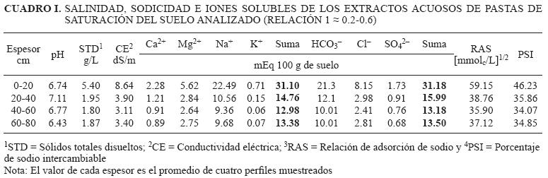 La salinidad inicial (Si) determinada en el RSC y la CE promedio del extracto de saturación del suelo en los espesores de los perfiles analizados, indican que el espesor 0-20 cm (horizonte A1) acumula alta concentración de sales (5.40 g/L ó CE medida de 8.64 dS/m), que disminuye de manera abrupta hasta el espesor 60-80 cm (1.87 g/L de sales ó CE medida de 3.40 dS/m). Este patrón de acumulación fue explicado por Oster y Schroer (1979) quienes indican que la repetición del ciclo humedad-sequía origina la concentración de una gran cantidad de sales en la zona de fluctuación de agua, pero no en la de saturación, por ello la acumulación salina es máxima en la superficie. Estos valores corresponden a suelos que dado el deficiente drenaje natural, manto freático poco profundo y ascenso capilar de aguas por excesiva evaporación y escasa precipitación pluvial en estiaje, acumulan sales en la superficie a concentraciones que exceden el umbral de tolerancia de las glicófitas, estimado en 2.56 g/L de concentración de la solución del suelo, equivalente a una CE de 4.0 dS/m (Maas 1985) y que limitan el crecimiento y desarrollo de las plantas cultivadas. Asimismo su reacción es neutra a ligeramente alcalina, sin embargo son proclives a generar reacción alcalina dados los valores de RAS > 20 y de PSI > 15% (Cuadro I), lo que implica un grado de restricción de uso agrícola moderado con afectaciones por disminución de la infiltración de agua del suelo (Ayers y Westcot 1987); fenómeno propio de una tipogénesis salino-sódica que los identifica como Solonchaks (Szabolcs 1989).