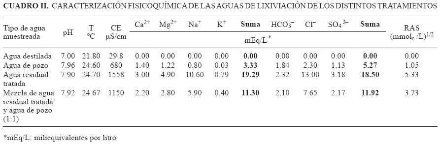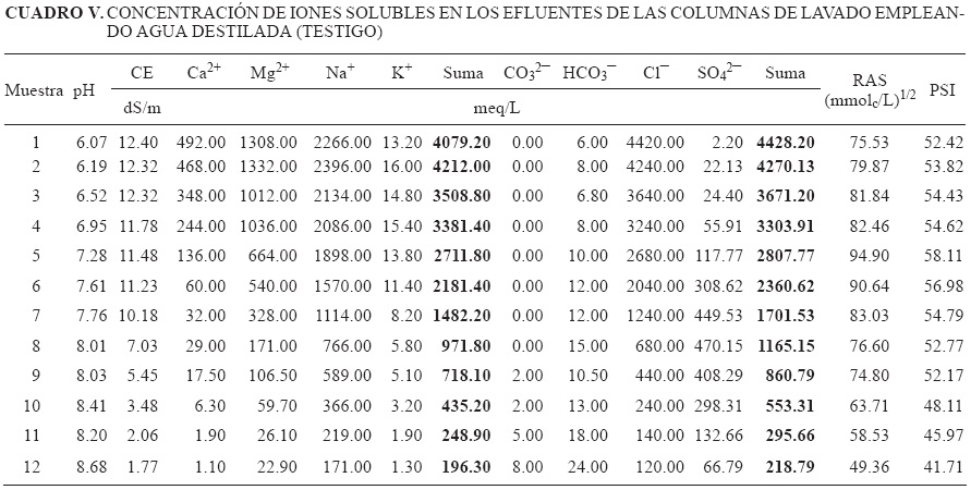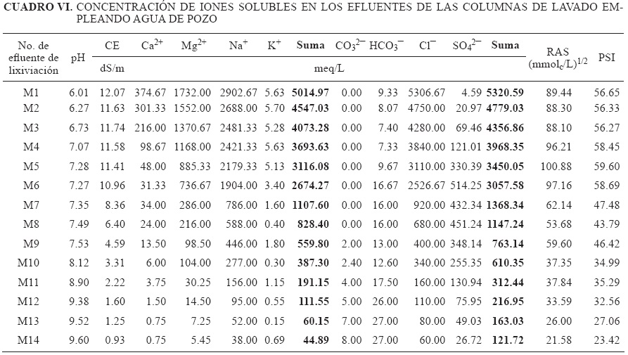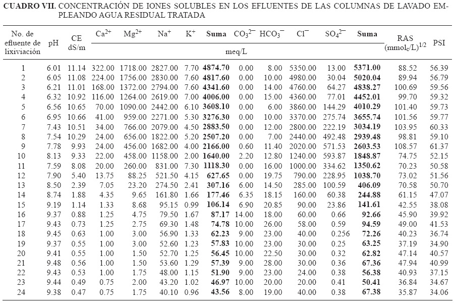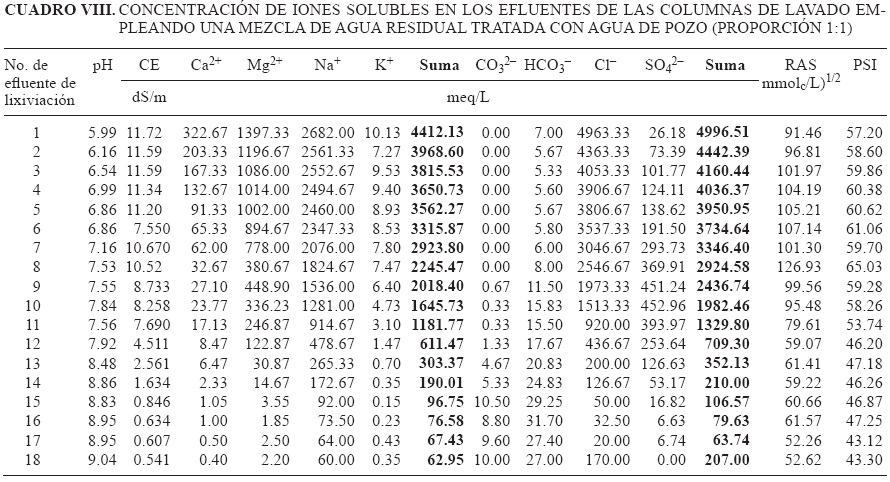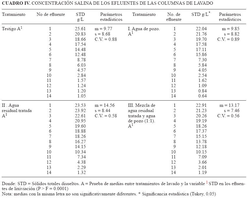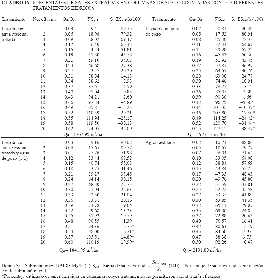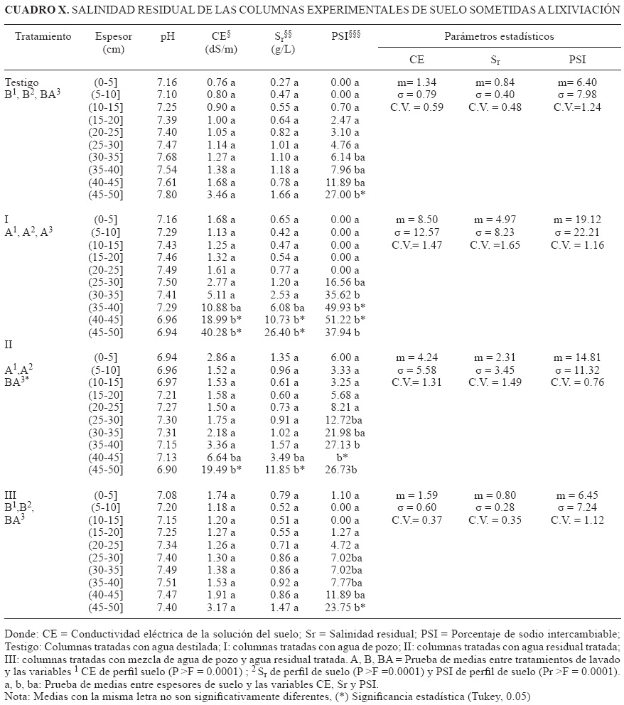 Los resultados indican que los tratamientos I (agua de pozo) y II (agua residual tratada), extraen más sales de las columnas del suelo y presentan diferencia significativa respecto del tratamiento con la mezcla hídrica (estadísticamente igual al testigo), sin que esto demerite la capacidad lixiviadora de la mezcla hídrica (Cuadro X). El uso de agua residual tratada como agua de lavado tiene la ventaja de aportar materia orgánica al suelo, pero la desventaja de incrementar el PSI que en el tiempo destruye la estructura del suelo, incrementa el nivel salino de la solución y dificulta la eficiencia de lavado si el suelo no cuenta con adecuado drenaje natural o artificial. Efectos similares fueron reportados por Villafañe et al. (2002).