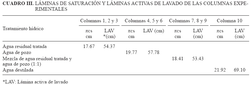 La diferencia entre láminas activas de lavado se atribuye a cambios en el espacio poroso del suelo, derivados de la heterogeneidad en la compactación manual mecánica, que alteró la densidad real del suelo y con ello disminuyó el espacio poroso y el ingreso y velocidad de infiltración de agua a través de las columnas, como se observa en el cuadro III. Esta diferencia de espacio poroso determinó que el proceso de lavado tardara menos tiempo en las columnas sometidas a los tratamientos testigo y de agua de pozo, y que fuera más extenso en los tratamientos de agua residual tratada y de la mezcla hídrica residual con agua de pozo. La disminución en la tasa de infiltración en los dos últimos tratamientos está vinculada con la alta concentración de sales sódicas que contienen las aguas residuales y que producen a su paso por el suelo procesos de hidrólisis alcalina, que a su vez producen defloculación de las partículas del suelo y destrucción de su estructura, todo lo cual genera condiciones de impermeabilidad.