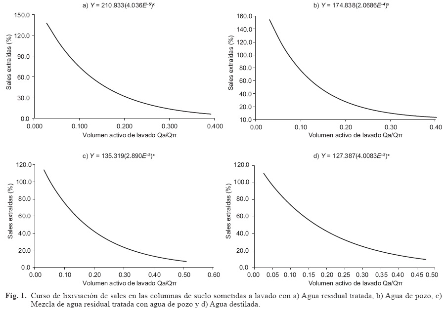 La cuantificación de sales extraídas se inició al colectarse la primera gota del efluente. Al efecto se consideró que el volumen de agua con el que se obtiene dicha gota, es el valor de la capacidad de saturación del suelo (Qπ); para investigadores como Safanov (1960) y Kovda (1980), es la constante de lavado de cualquier profundidad del suelo. La colecta de extractos acuosos continuó hasta obtener el volumen de lavado Qa/Qπ = 1, es decir un volumen de agua adicional al de saturación. El lavado experimental fue de 103 días (8 de noviembre de 2008 al 18 de febrero de 2009). Al obtenerse los volúmenes porosos Qa/Qπ, se quitaron las probetas y se eliminó la carga de agua de cada columna. Enseguida se extrajeron muestras de suelo en capas de 5.0 cm hasta completar diez espesores por columna que fueron secados al aire y trasladados al laboratorio para determinar su salinidad residual (Sr) y composición fisicoquímica. Los resultados del curso de lavado se graficaron en curvas de lixiviación de sales extraídas, ajustadas para fines de predicción a una función potencial del tipo Y = axb. En el eje de las abscisas se estableció la relación Qa/Qπ y en el eje de las ordenadas la relación