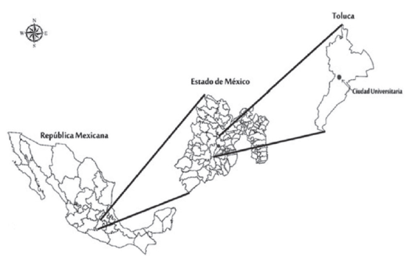 El Campus Ciudad Universitaria de la Universidad Autónoma del Estado de México se localiza en la porción noroeste de la ciudad de Toluca, Estado de México (Figura 1). Está ubicada en las coordenadas: 19° 17’ 17” latitud Norte y 99° 40’ 41” longitud oeste. La altitud es variable, pero en promedio tiene 2715 m sobre el nivel del mar (msnm). El Campus tiene una superficie total de 367 650 m2, de los cuales, 124 591 m2 corresponden a edificaciones, 173 445 m2 son áreas verdes y 69 614 m2 están ocupados con estacionamientos, andadores, aceras, áreas deportivas, patios, plazas culturales, escalinatas, accesos y afloramientos rocosos (Universidad Autónoma del Estado de México [UAEMéx], 2014).