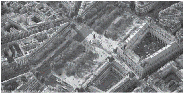 La calle Faubourg du Temple, que de ahora en adelante será nombrada como RFT, se inscribe en el marco de trabajos de renovación urbana de gran envergadura de la Plaza de la República. El proyecto de los arquitectos Trévelo & Viger-Kohler (TVK)13 tenía como objetivo crear un espacio público que asegurara el confort de todos los usuarios. La renovación de la plaza ofrece hoy en día distintas zonas para actividades culturales, festivas, terrazas de café, y también permite disfrutar el espacio de forma cotidiana, individual o en grupo: "la plaza ha reforzado su papel de zona de paso y de cambio de modo de transporte garantizado por un vasto espacio peatonal" (véase foto 1).14