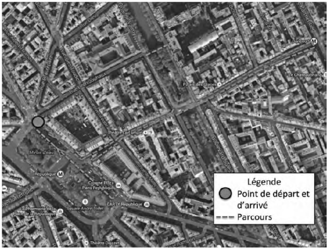 Las trayectorias definidas con base en las informaciones recogidas en las encuestas flash están principalmente relacionadas con los motivos diversión y regreso a casa, ya que la Plaza de la República es una plataforma de movilidad hacia el centro de París. Otra trayectoria son las orillas del canal Saint Martin, donde una de las actividades primordiales es el paseo y la deambulación nocturna.