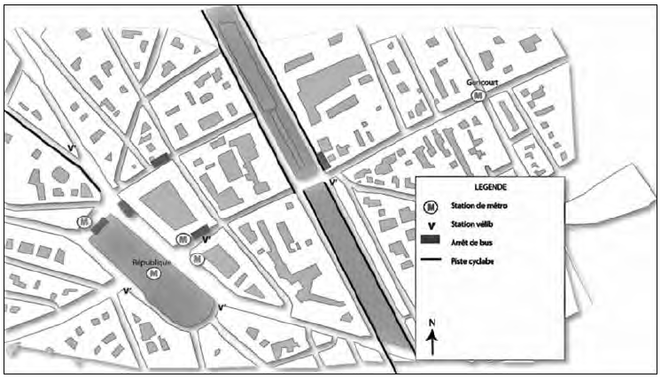 La RFT es una plataforma de movilidades, localizada en el sector de la Plaza de la República donde se cruzan cinco líneas de metro, cuatro líneas de autobús y siete grandes ejes viales; también se encuentran múltiples estaciones del sistema "Vélib" (bicicletas compartidas), así como paradas de taxis (véanse figs. 1y 1a).