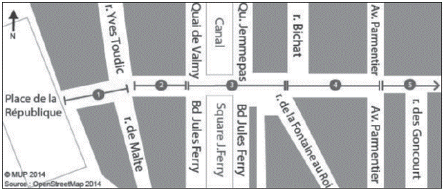 Para este estudio, la RFT fue dividida en cuatro segmentos (véase figura 2). Los trabajos de renovación de la Plaza de la República se extendieron hasta el cruce de las calles Yves Toudic y Malte, donde se creó una zona de encuentro (segmento 1) y se prohibió la circulación de vehículos particulares. El proyecto fue inaugurado el 16 de junio de 2013. En este segmento se encuentran edificios institucionales y algunos comercios como Go Sport, CMG Sports Club y Habitat. El segmento siguiente (2), que forma también parte de nuestro terreno de estudio, que va hasta el canal Saint Martin. En esta zona se localizan comercios sumamente variados: carnicerías, panaderías, papelerías, tiendas de telas y ropa, locales de comida rápida y dos cafés (bares) que funcionan las 24 horas de manera informal.19 Como veremos más adelante, estos últimos son uno de los principales motores de la animación nocturna de la calle. A partir del canal Saint Martin y hasta la calle Bichat (segmento 3) y de ésta hasta el metro Goncourt (segmento 4), la fisionomía de la calle cambia, ya que esta zona es la frontera entre la RFT y Belleville, otro barrio sumamente popular y cosmopolita, con una intensa afluencia turística y la influencia del barrio chino, que se observa por la gran presencia de restaurantes de comida asiática y comercios de ropa de manufactura china.