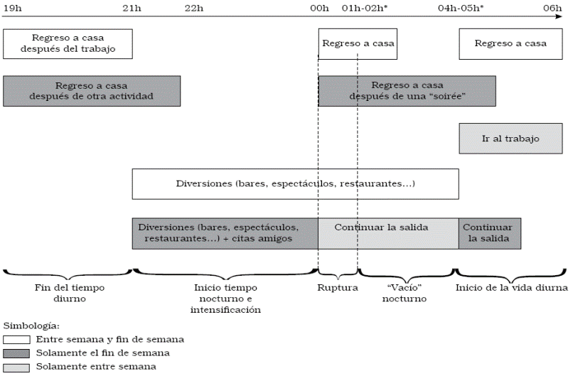 La ciudad vive al ritmo de diversas temporalidades: las estaciones del año, los días laborales, los fines de semana, las vacaciones escolares, los periodos de afluencia durante el día, la alternancia día/noche. En este sentido, la noche no es solamente un espacio tiempo de actividades ilegales;9 también es el escenario de usos y prácticas urbanas (Gwiazdzinski, 2006). Los tiempos sociales y modos de vida han cambiado, dando lugar a nuevos ritmos y, por ende, a diversas temporalidades urbanas:
