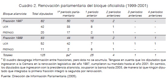 De acuerdo con la composición de grupo y su lugar en el esquema de comisiones, interesa saber qué impacto se observa en el éxito parlamentario alcanzado (101 leyes sancionadas) en los dos años de gestión, el cual mantuvo su condición oficialista hasta la renuncia de De la Rúa el 20 de diciembre de 2001, momento en que el gobierno pasó a manos del Partido Justicialista. Durante ese lapso, el bloque oficial inicial de 125 diputados tuvo dos rupturas formales durante 2001, en una de éstas nueve diputados conformaron dos bloques disidentes: Argentinos por una República de Iguales (con dos diputados radicales y tres socialistas) y Frente para el Cambio (con cuatro diputados frepasistas).