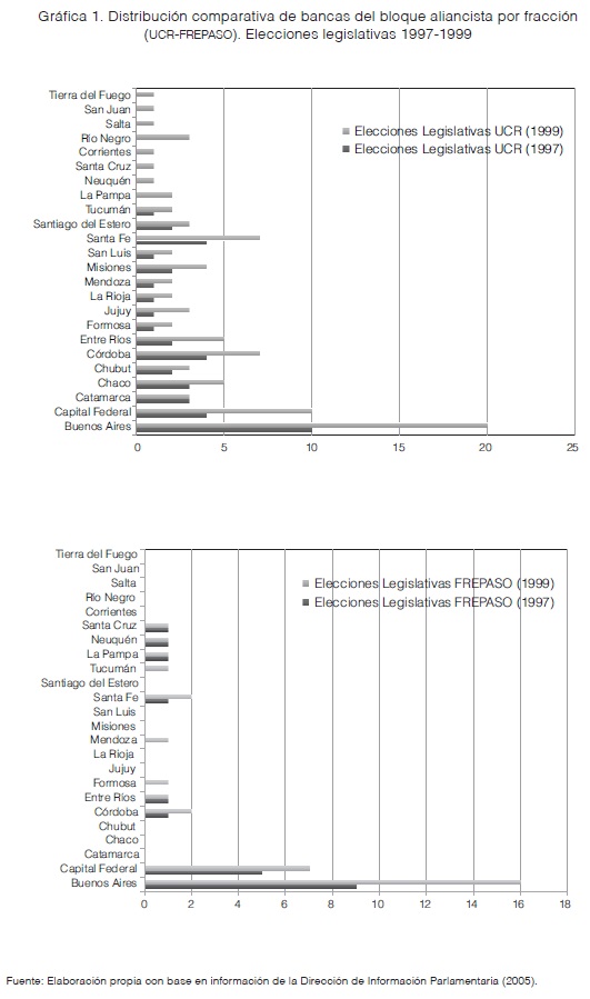 El primer acuerdo electoral de fracciones en 1997 denotó un balance positivo al conseguir el primer grupo parlamentario de 62 diputados, los cuales constituyeron prácticamente el 50% del total del bloque que ingresó en 1999, con alta influencia de Capital Federal y la Provincia de Buenos Aires en los acuerdos. Al inicio del periodo parlamentario 118, el bloque oficial se integró con 29 diputados provenientes de distritos donde el Frepaso no obtuvo representación. El funcionamiento de la Alianza y del bloque parlamentario en la Cámara, entonces, dependería del nivel de fusión y aceptación que encontrase dentro de la estructura radical.