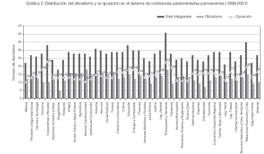 Esta distribución muestra que entre diputados oficialistas y opositores no se respetó el mapa político de la Cámara, ya que 29 comisiones del total del sistema de comisiones de dicha institución tuvieron mayoría opositora, aun cuando su jefatura quedara a cargo del oficialismo. Si la asignación se evalúa en términos de fuerza dentro del oficialismo, 50% de las presidencias quedó en manos de legisladores pertenecientes al núcleo originario de la coalición.