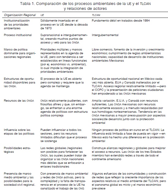Pese a las diferencias y considerando en especial que una es una entidad supranacional y la otra es un área de libre comercio intergubernamental, encontramos algunas similitudes entre las dos regiones. La tabla 1 muestra los puntos básicos de la comparación entre ellas. En ambos casos, las ONGA se han esforzado por maximizar su impacto en los resultados (aun cuando, para el TLCAN, los resultados de política relevantes se resumen en el cumplimiento a nivel nacional). La ausencia de un proceso legislativo en el TLCAN y la falta de alguna reforma institucional significan que la actividad de las ONGA se concreta a garantizar el cumplimiento a nivel nacional y a influenciar en los programas de trabajo y desarrollo de capacidad provenientes del Secretariado del CCA.