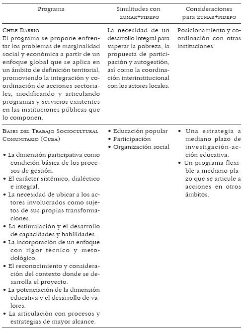 Analizar el programa ZUMAR+FIDEPO a la luz de otros programas similares en América Latina tiene como objeto reconocer tanto similitudes y fortalezas como debilidades del programa. Se escogieron dos programas de los que no sólo se contaba con información documental, sino también con información directa de diversas instancias respecto a su estructura orgánica.